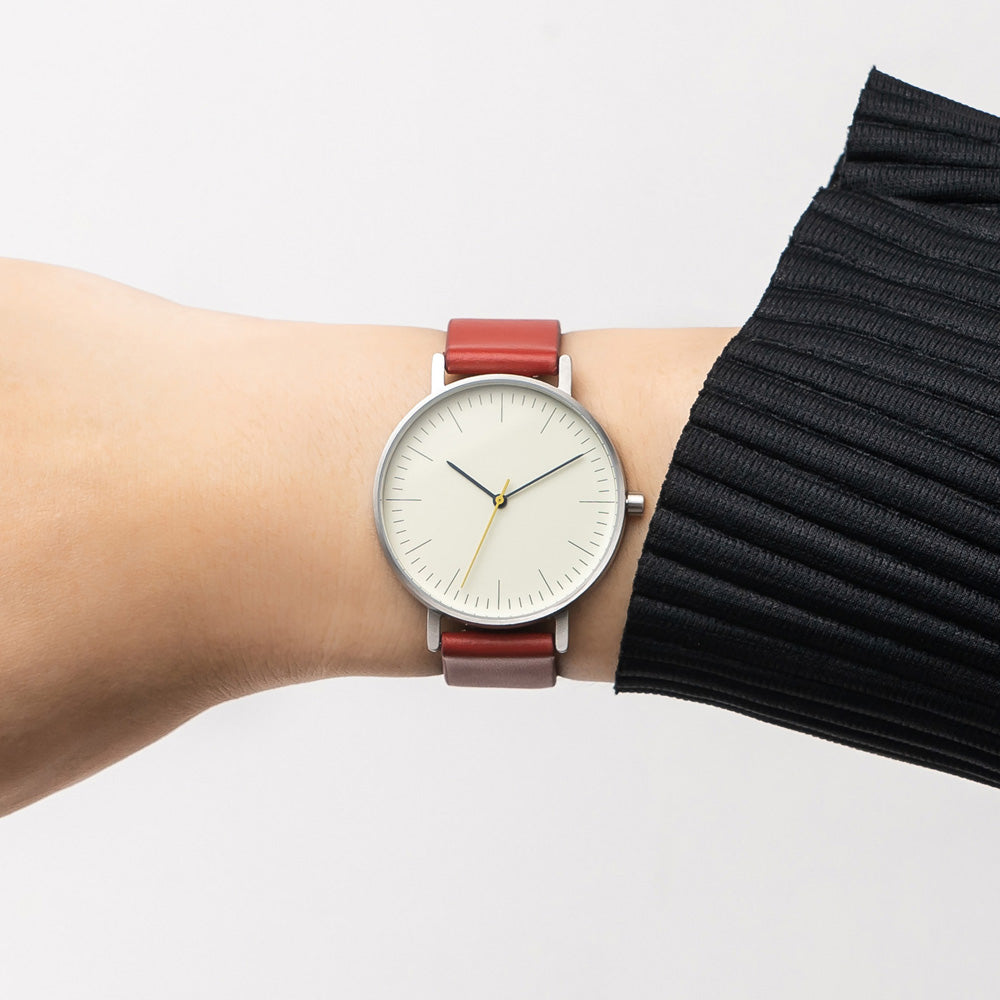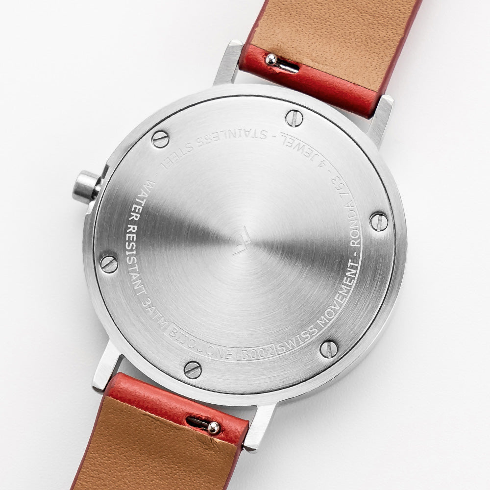 - Strap: Premium red Leather, 18mm wide, Quick-release springbar (easily interchangeable)
